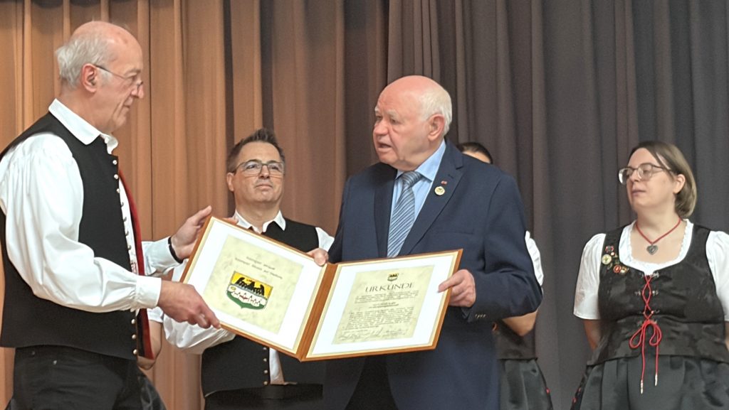 Ein weiterer Höhepunkt war die Verleihung der Ehrennadel in Gold für das Ungarndeutschtum – die höchste Auszeichnung der Landesselbstverwaltung der Ungarndeutschen. Mit ihr wurden Persönlichkeiten geehrt, die sich in herausragender Weise und über viele Jahre hinweg für die ungarndeutsche Gemeinschaft eingesetzt haben. Die Übergabe erfolgte durch die Vorsitzende Ibolya Hock-Englender.